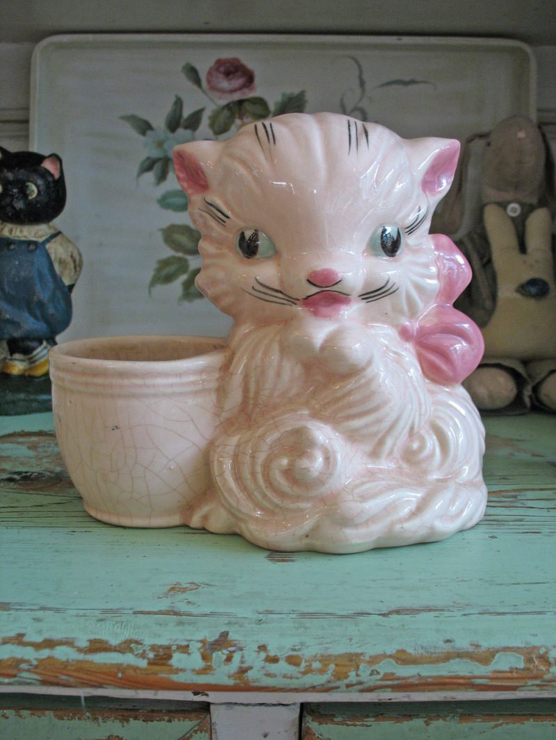 Im soooo super excited to have finally had a chance to go browsing thru a Flea Market again. After being super busy with my newborn daughter, and toddler son I’ve had zero time to indulge in a pasttime hobby. With money in my wallet I was on a mission! While on a recent trip to visit my parents in Pensacola, FL I stopped by one of my favorite Flea Markets and found a few special treasures and keepsakes. This first piece is a Hull kitten planter. I have a small collection of kitty salt and pepper shakers in my kitchen, and thought this piece was too darling and needed to come home with me.