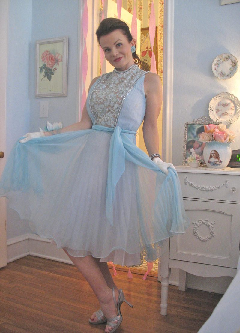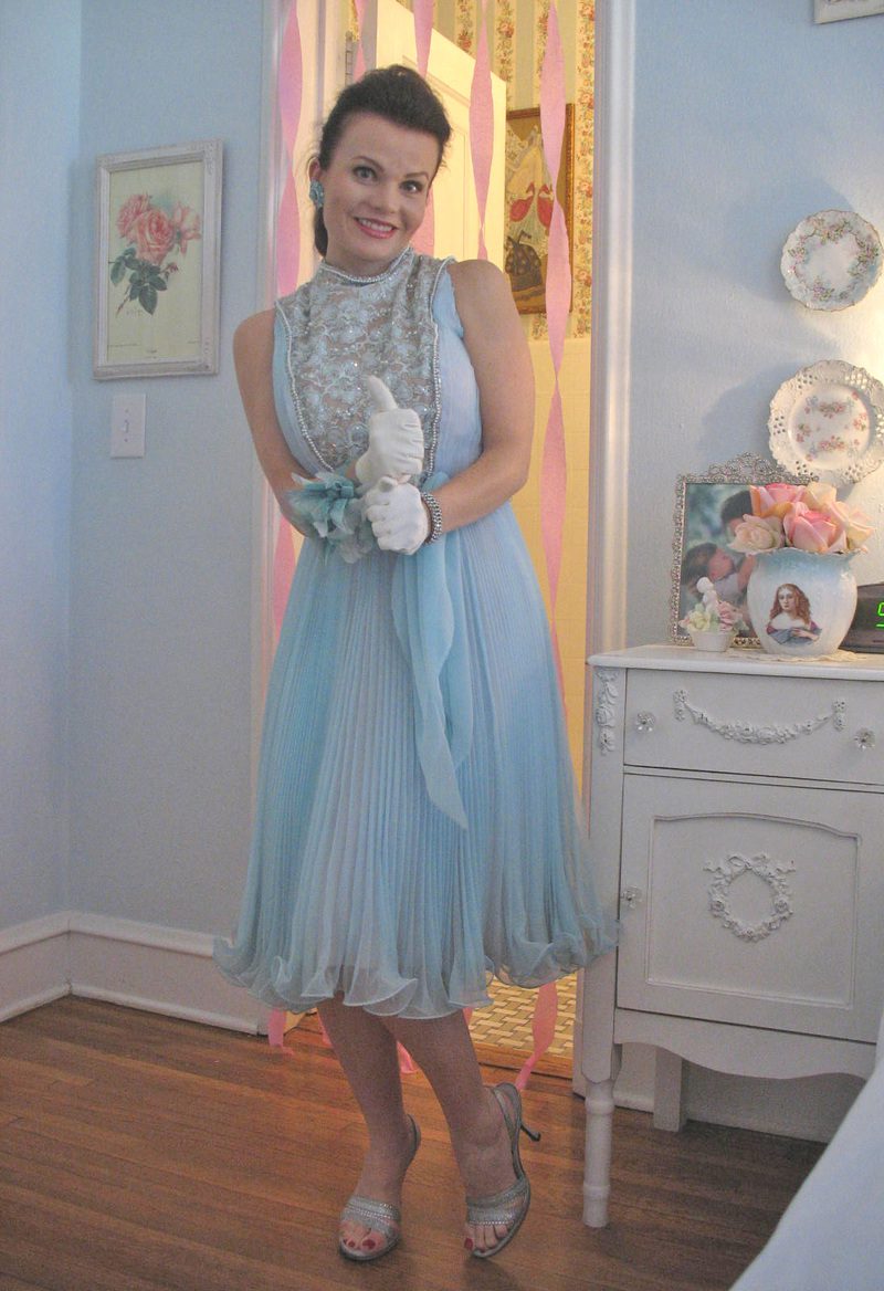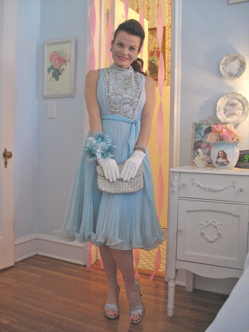 OH, LOVE your vintage dress…. I cannot believe you got it for ten bucks! Lucky girl. You look just gorgeous in it, as usual. I’m crackin up at your REAL prom dress… it’s so funny our hair back then! mine was so tall it wouldn’t all fit in my driver’s license picture! LOL Love all your fun poses, I’m hand jivin with you now! XOXO Holly