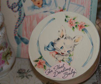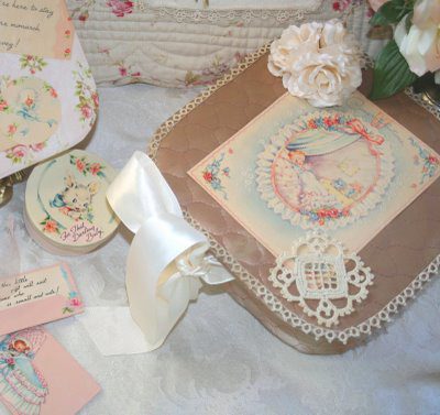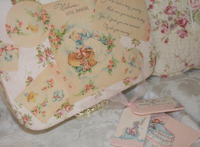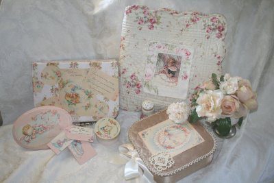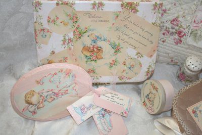 Ok……NOW! Back to crafting, pretties, and yummy creations!!! I am in LOOOOOVVVEEEE with my sweet friend Cheryl from Rosey Posey Confections newest creations. I just HAVE to show it off!!! You must skip over to her blog and read more about it. We all know there is nothing MORE SWEETER or PRECIOUS than babies. Right? Well, check out this collection of Vintage baby keepsake items. My heart melted when I first laid eyes on her "to die for" sweet keepsake treasures. She has made a keepsake box with the most precious baby vintage images, and has adorned it and filled it with ALL the sentimental treasures! Next, she made a little traveler suitcase. Omigoodness!! It ooozzess sweetness! Lastly, Cheryl is working on completing a "She’s my doll" fabric book. It has embroidery, vintage images printed on fabric, ephemera, beautiful fabric and more! She will be listing it on her ebay site later this week. These truly would make the most fabulous baby shower gift (you would be the talk of the party!) , or keepsakes for your own precious lamb to have. They are soooo beautiful, unique and one of a kind! Here are a few pics to wet your whistle. Skip on over to her site and say "Hi". ๐