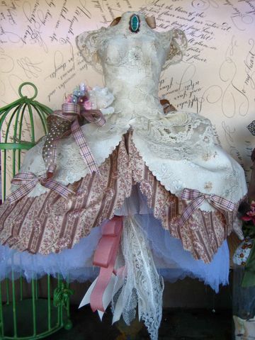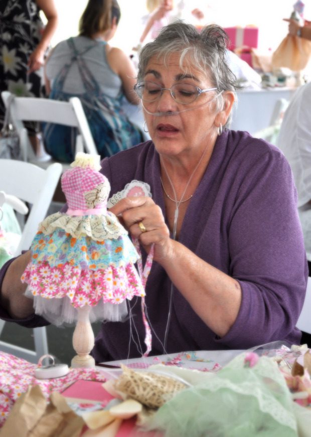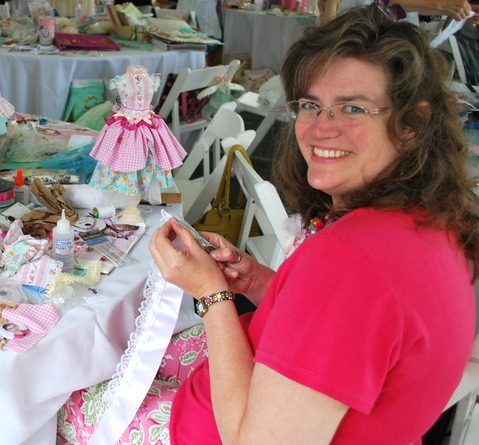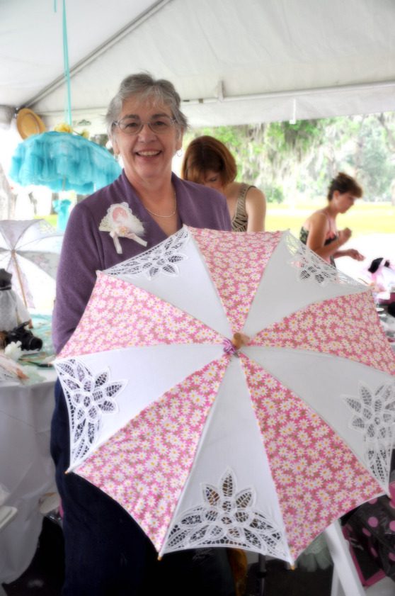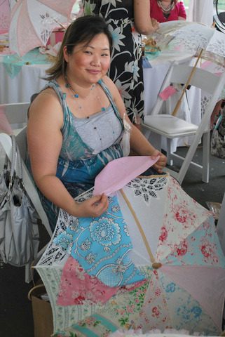 Amada Lebel working on her parasol. Her fabric was gorgeous with the sweet little birdies and cages!