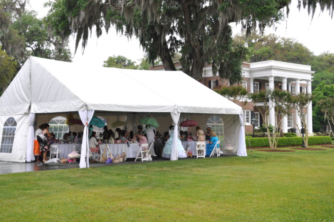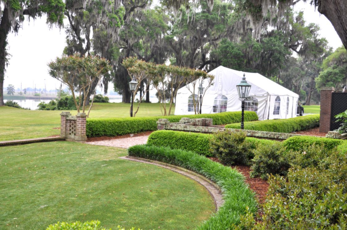 The tent was set up on the back lawn of the Main house underneath large spanish moss covered oak trees, and overlooking the river. It had the most beautiful scenic view!