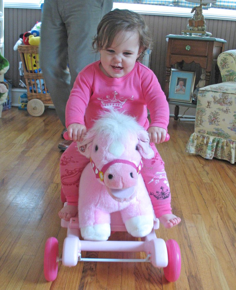 This evening I took this super sweet pic of my cutie-pie Vivi. She just had her bath (hence the wild wet hair) and she is riding her pink pony.