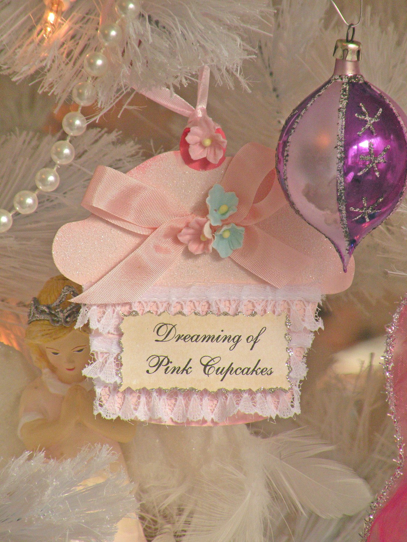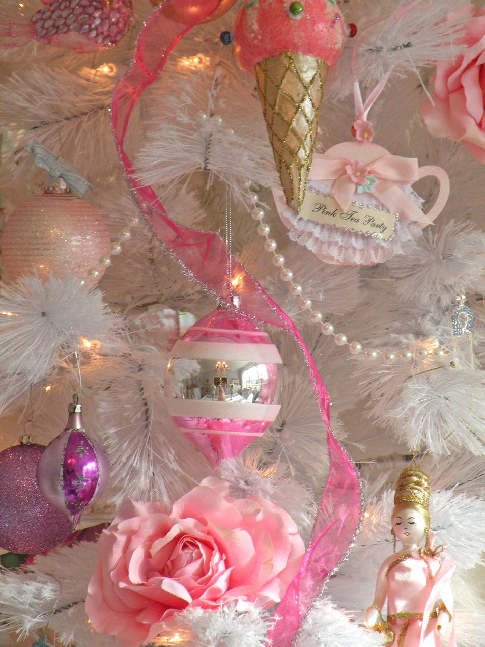 Oh I love everything. The chandelier is just fabulous! I really like the pink tea party teapot and dreaming of pink cupcakes ornaments! Did you make them? They have your name written all over them. They are so sweet!