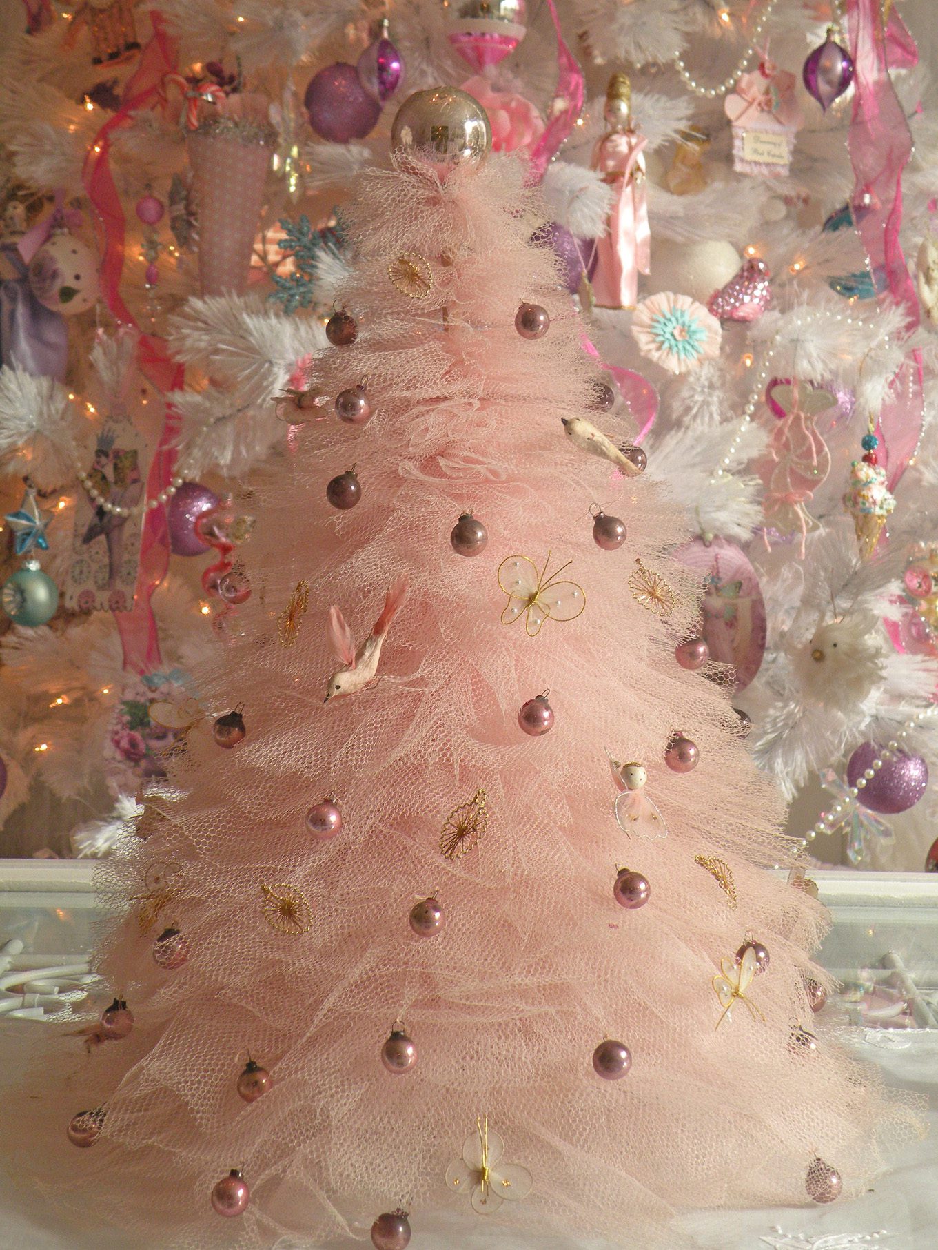 This very old vintage delicate tulle tree is a rare find from an Estate Sale. I just love pulling it out every year!