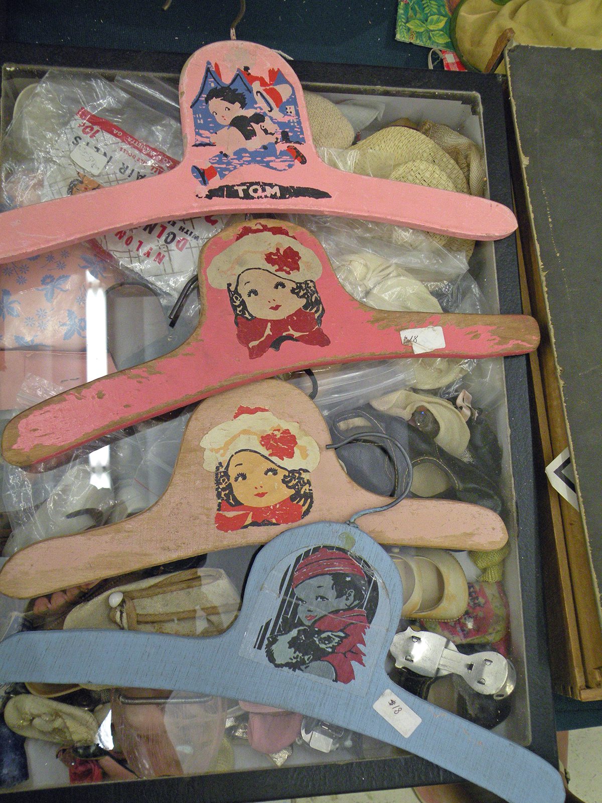 Wow, looks like so much fun. I LOVE the doll in the blue bathing suit with red polka dots and I LOVE the vintage hangers!