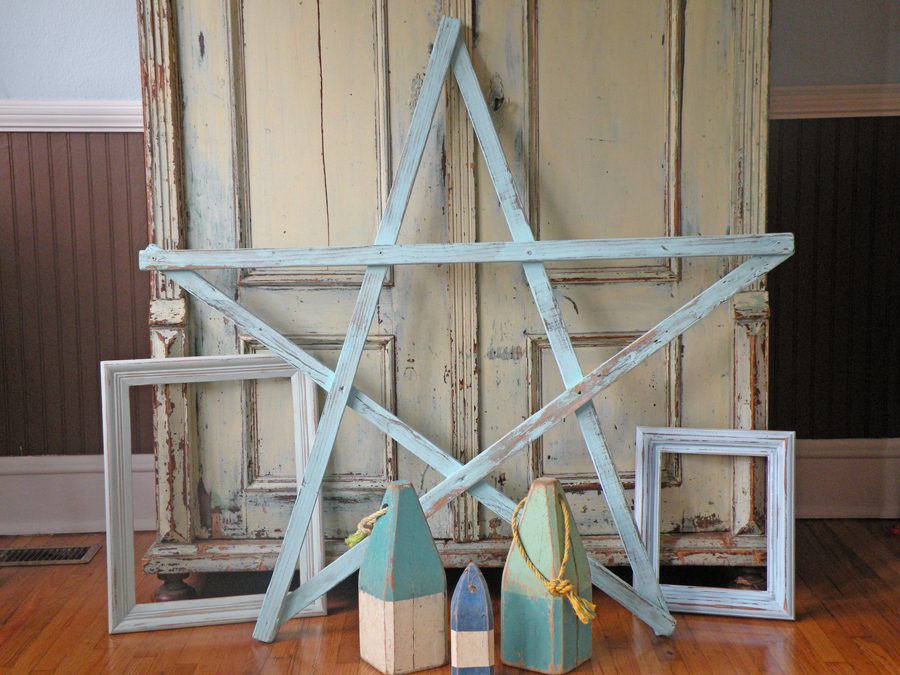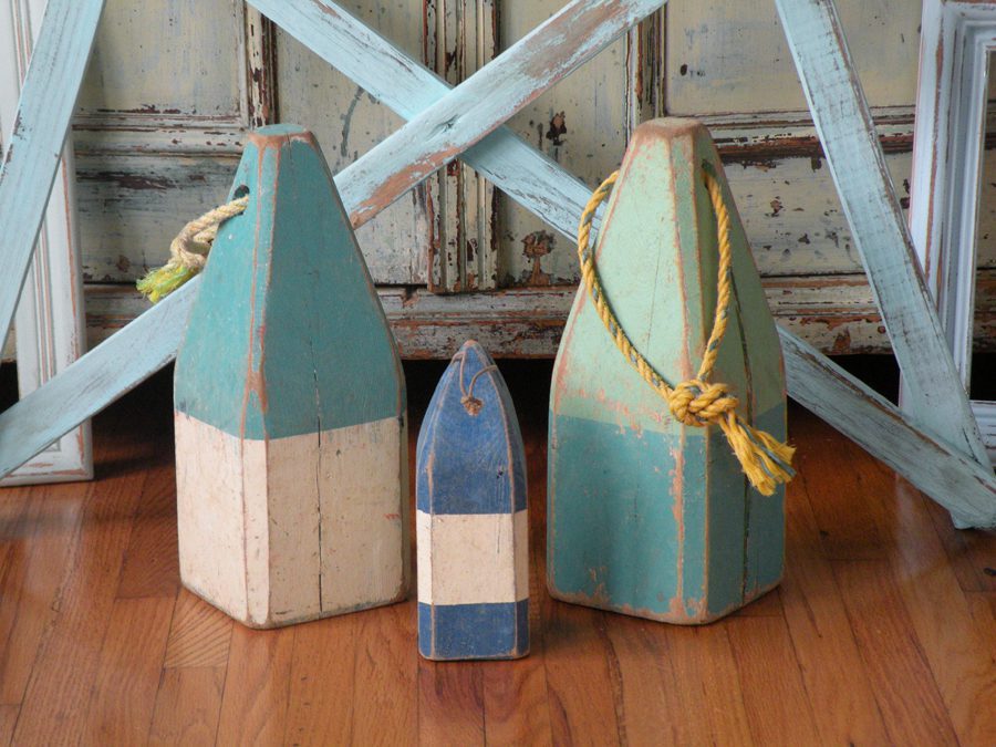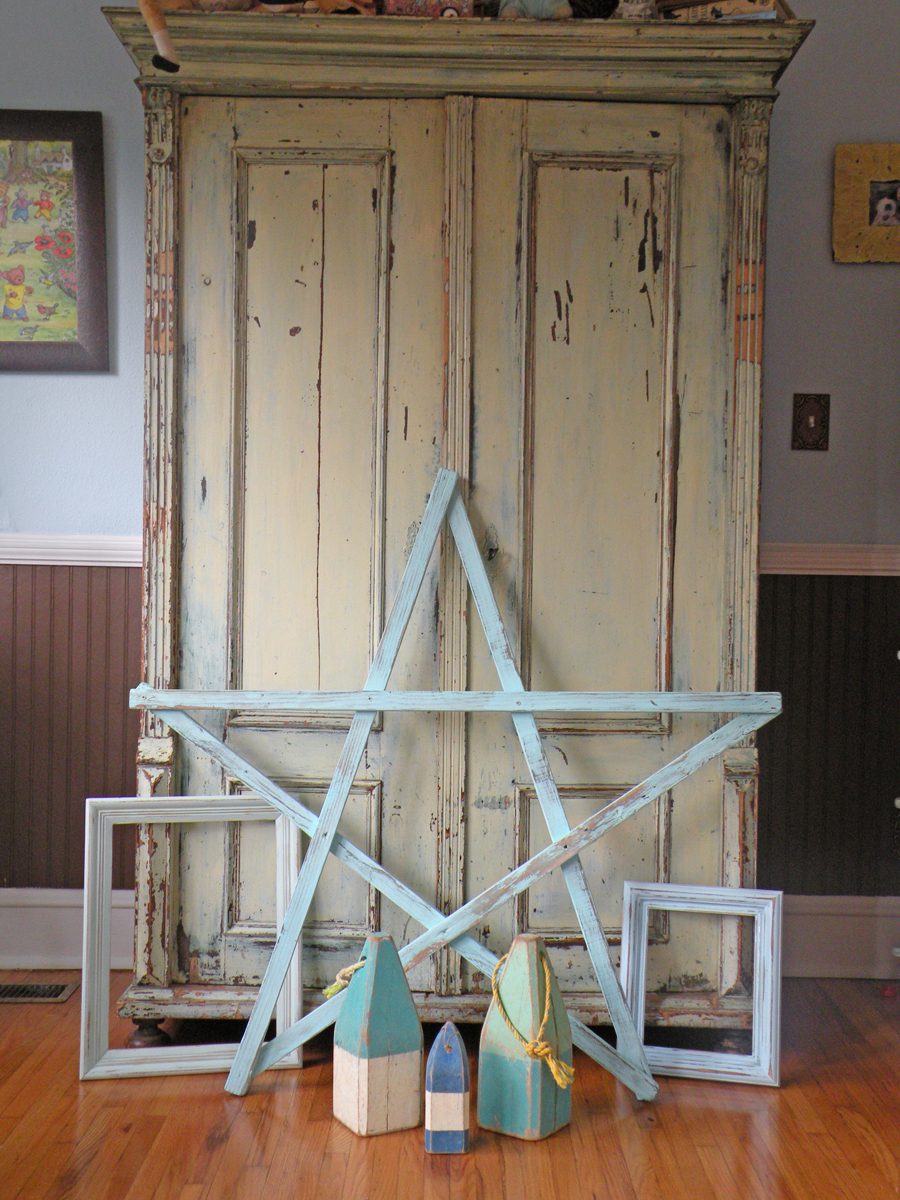 I found these already painted blue and green picture frames, and these vintage bouys.