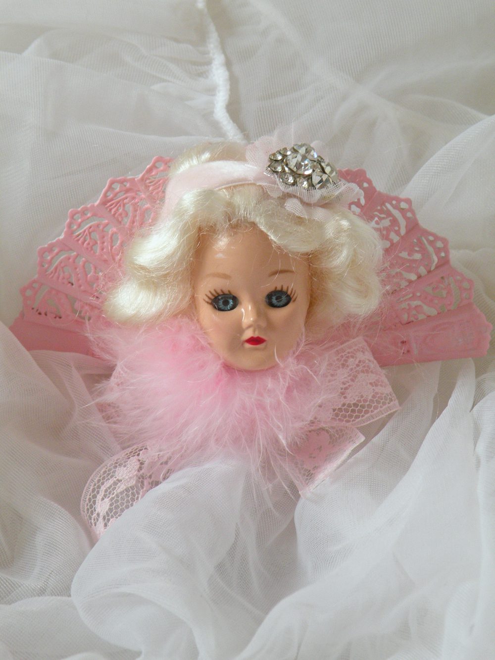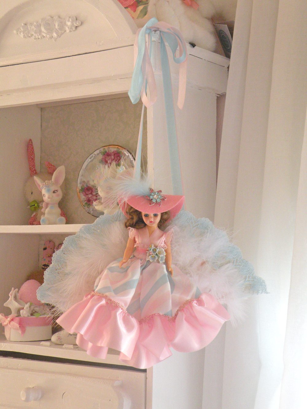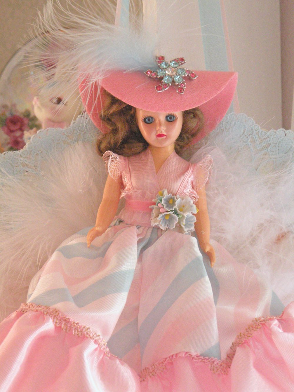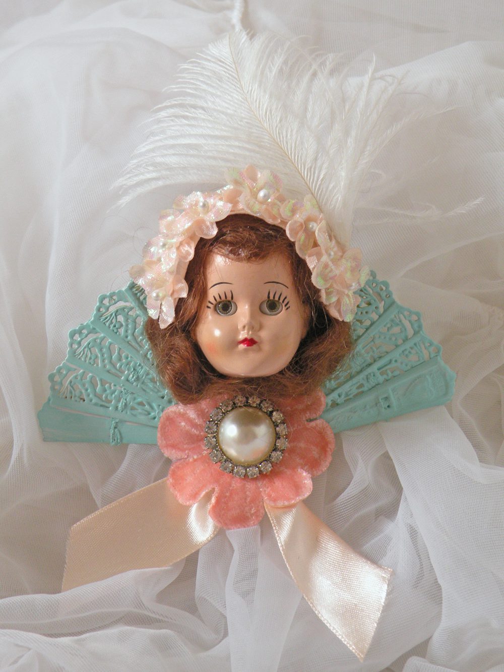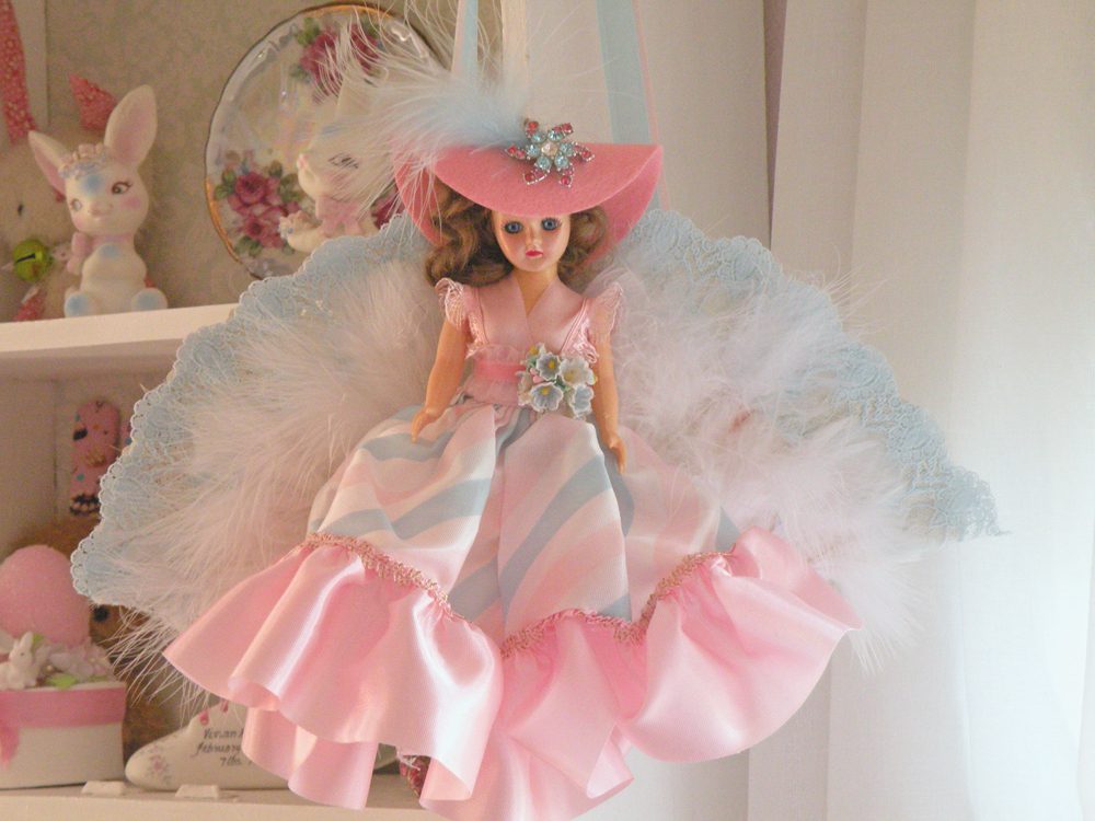 This next sweet little beauty is a Southern Belle doll fan named Savannah. You can hang and display her in your favorite little spot. The fan is embellished with blue lace, and white feathers. The doll is wearing her original mint dress. I LOVE the soft candy colors! I adorned her with extra fluff and pretties.