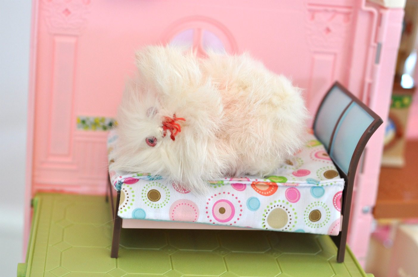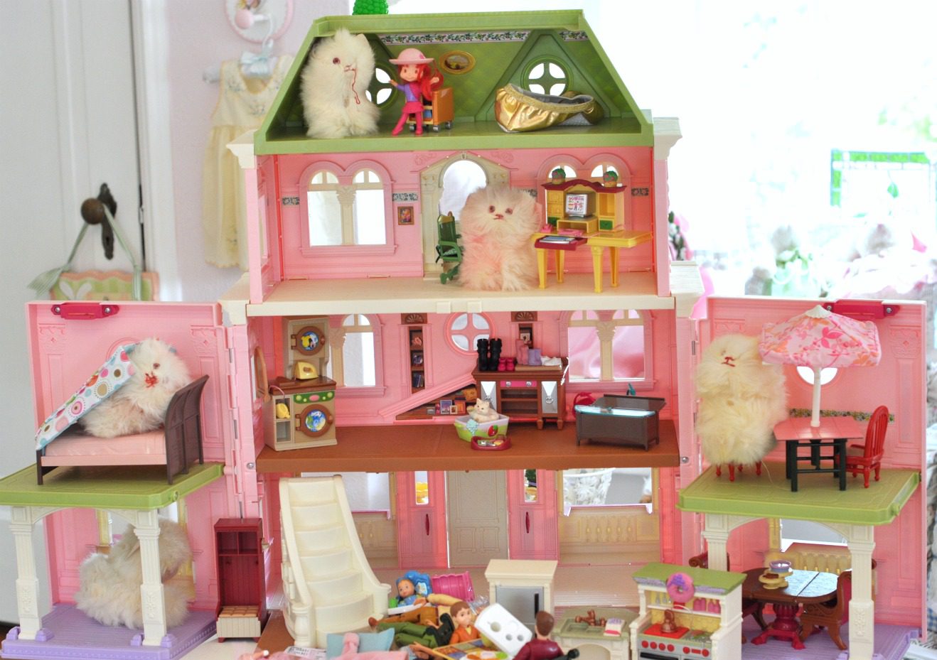 We both had a terrific idea of letting the kitties hang out in the dollhouse.