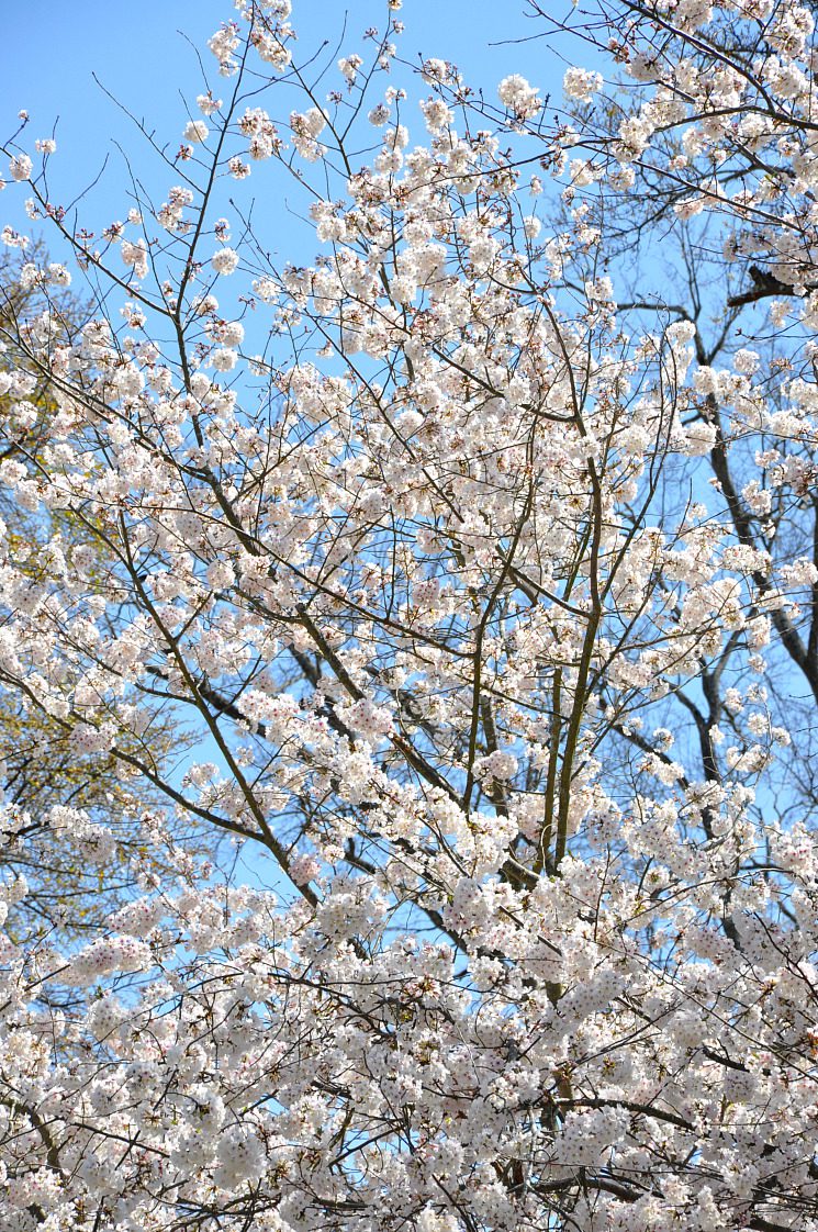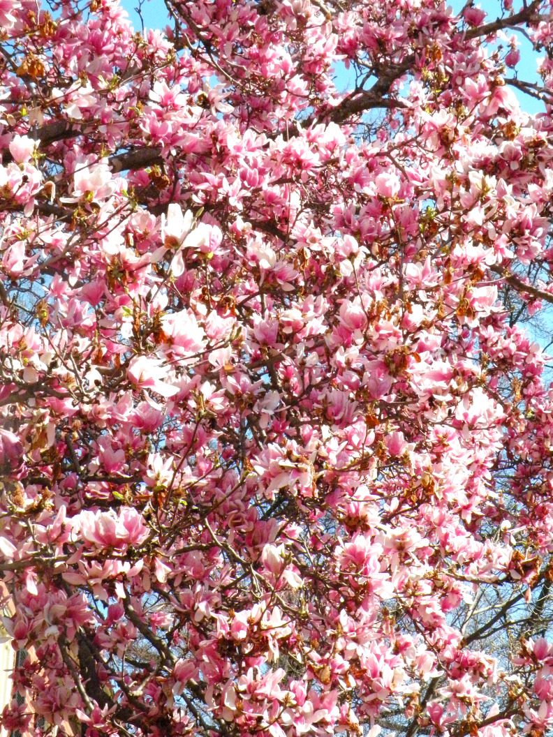 Cherry blossom trees have blossomed and look like fluffy white popcorn as my son calls it. There is a gorgeous Japanese Magnolia next to our yard that has the fullest pink blossoms.