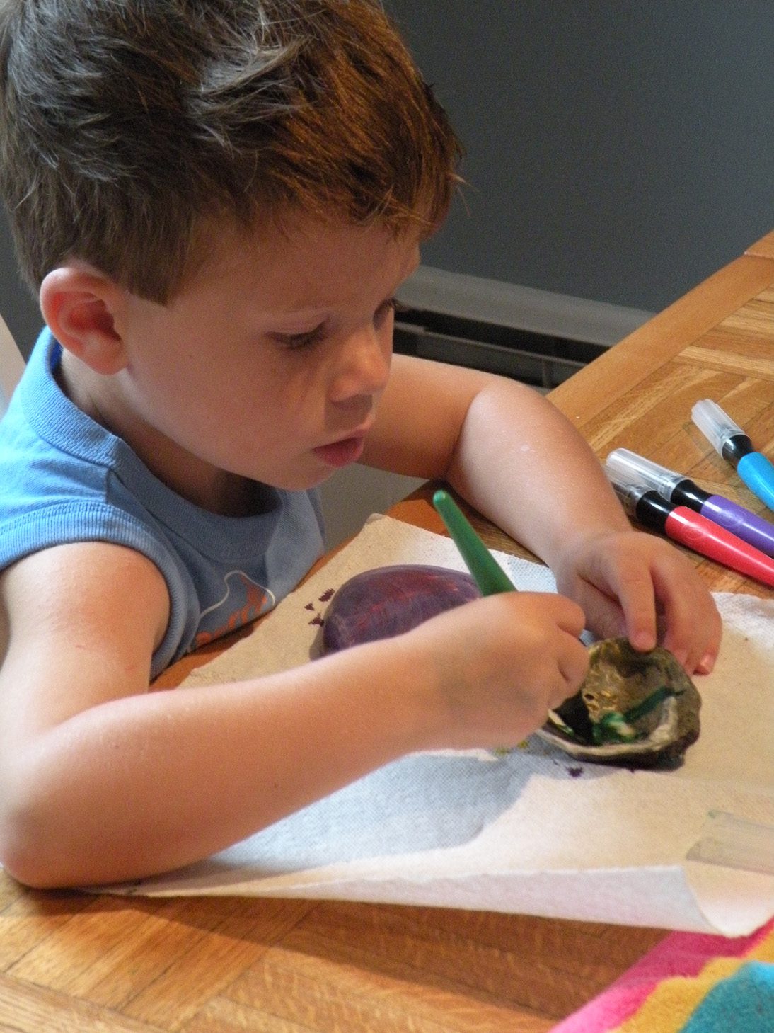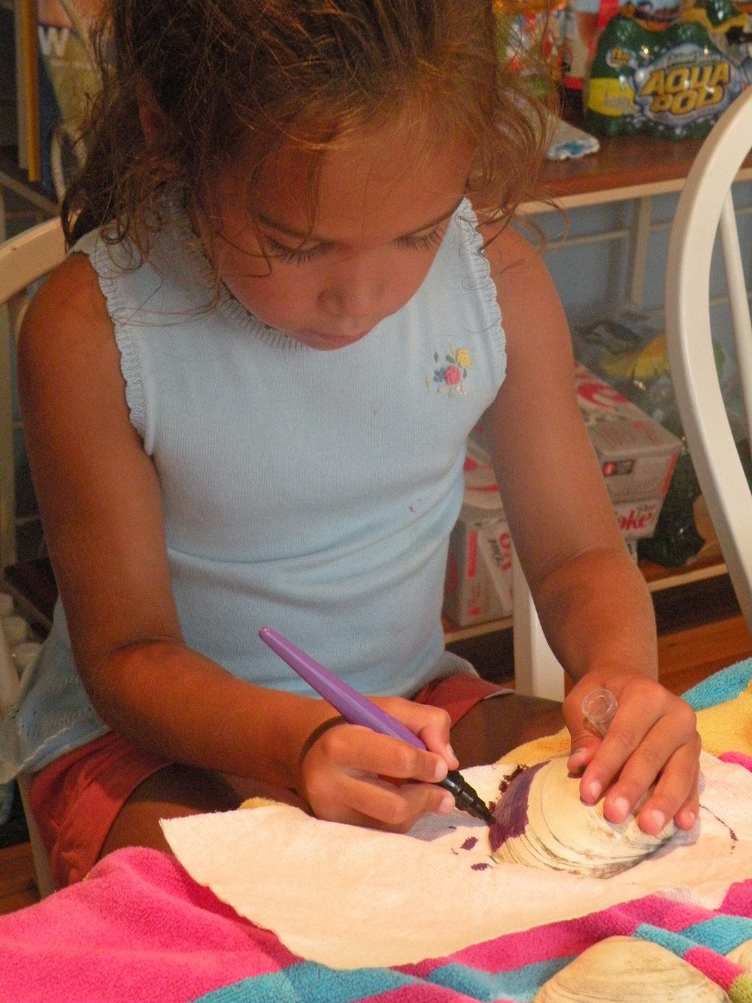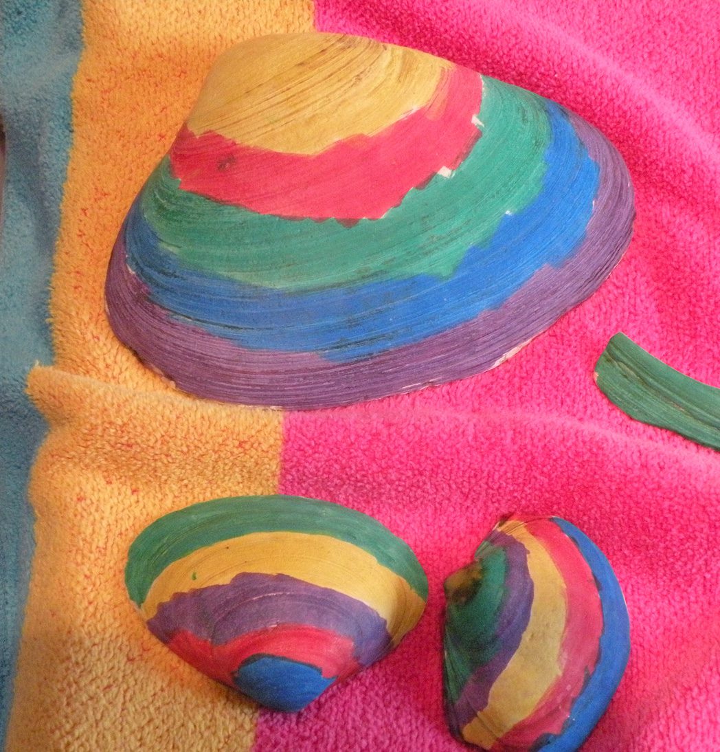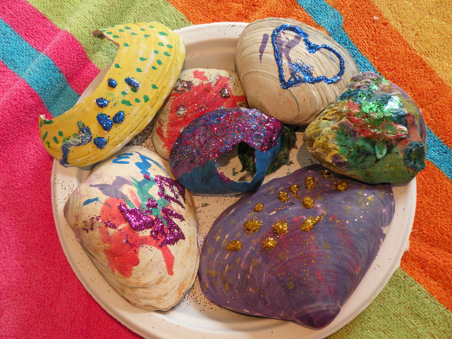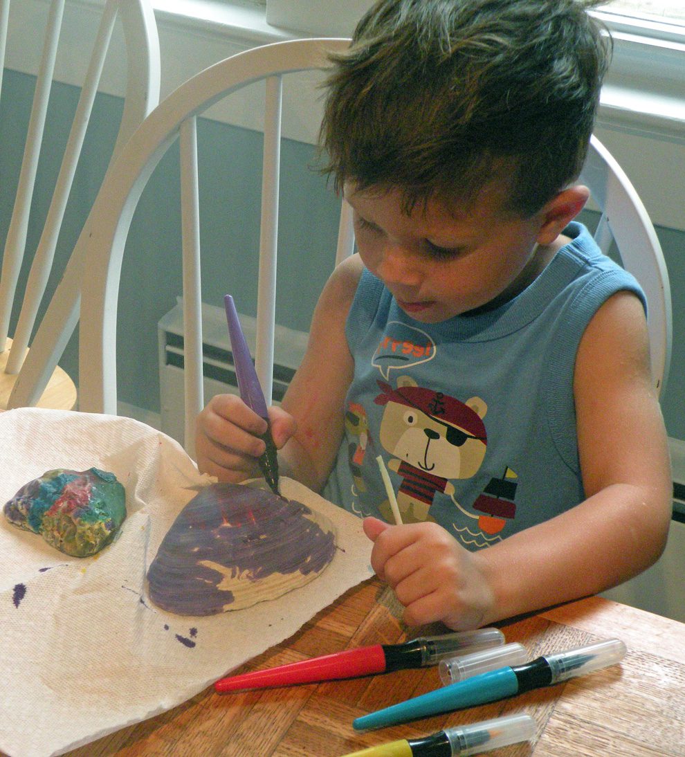 After we collected seashells and cleaned them, the children used paint pens and glitter to decorate them.