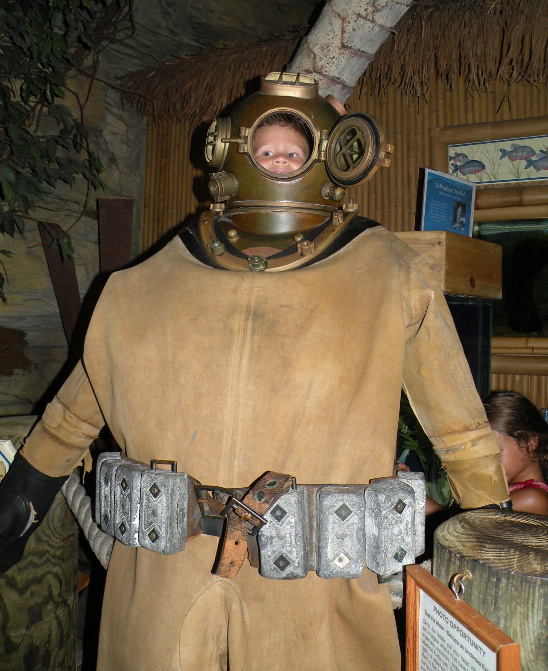 Grant peeking out of an old diver suit.
