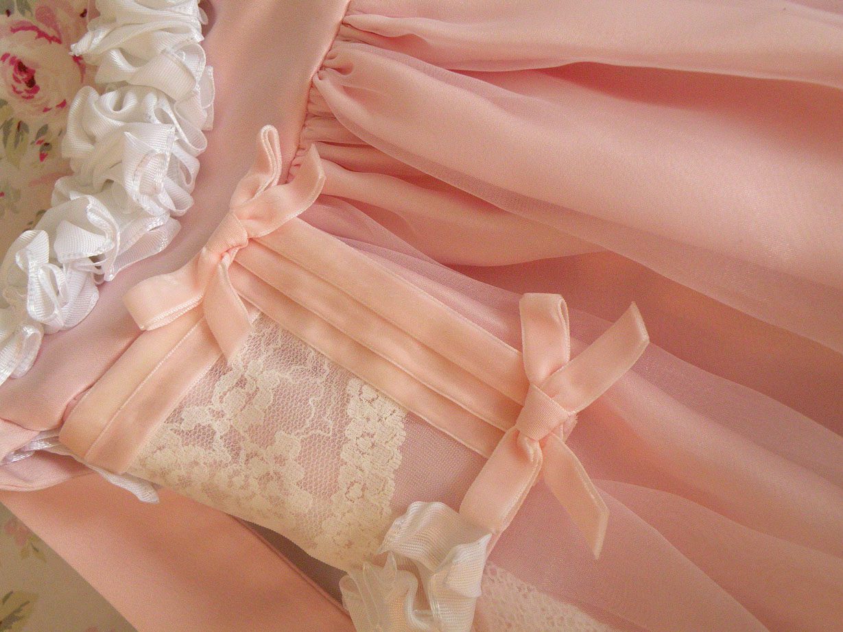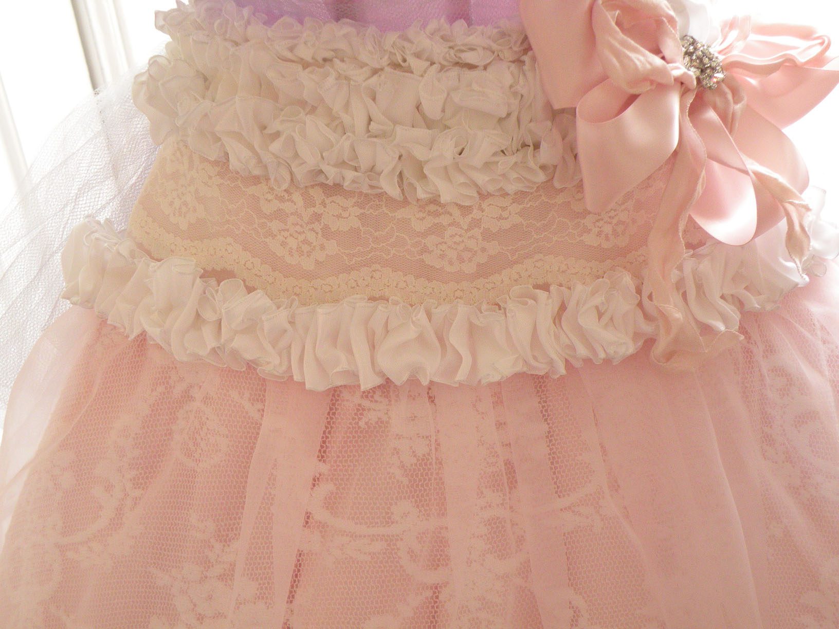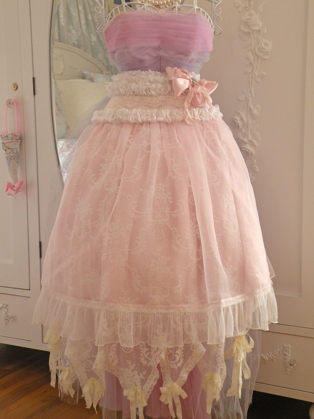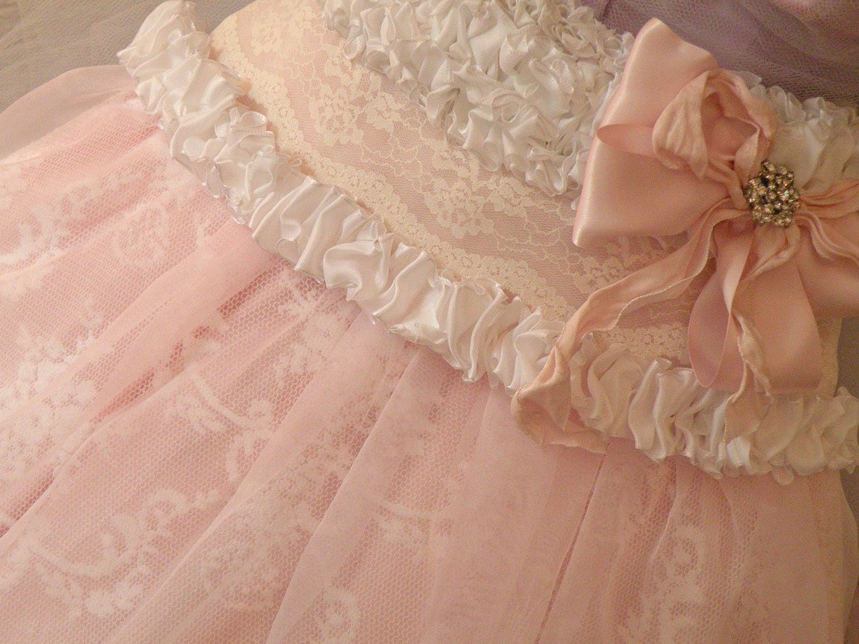To me I like to describe it as a grand decadent pink chiffon layer cake. Layers of ruffle and vintage lace. The ruffle is the the icing on the cake!