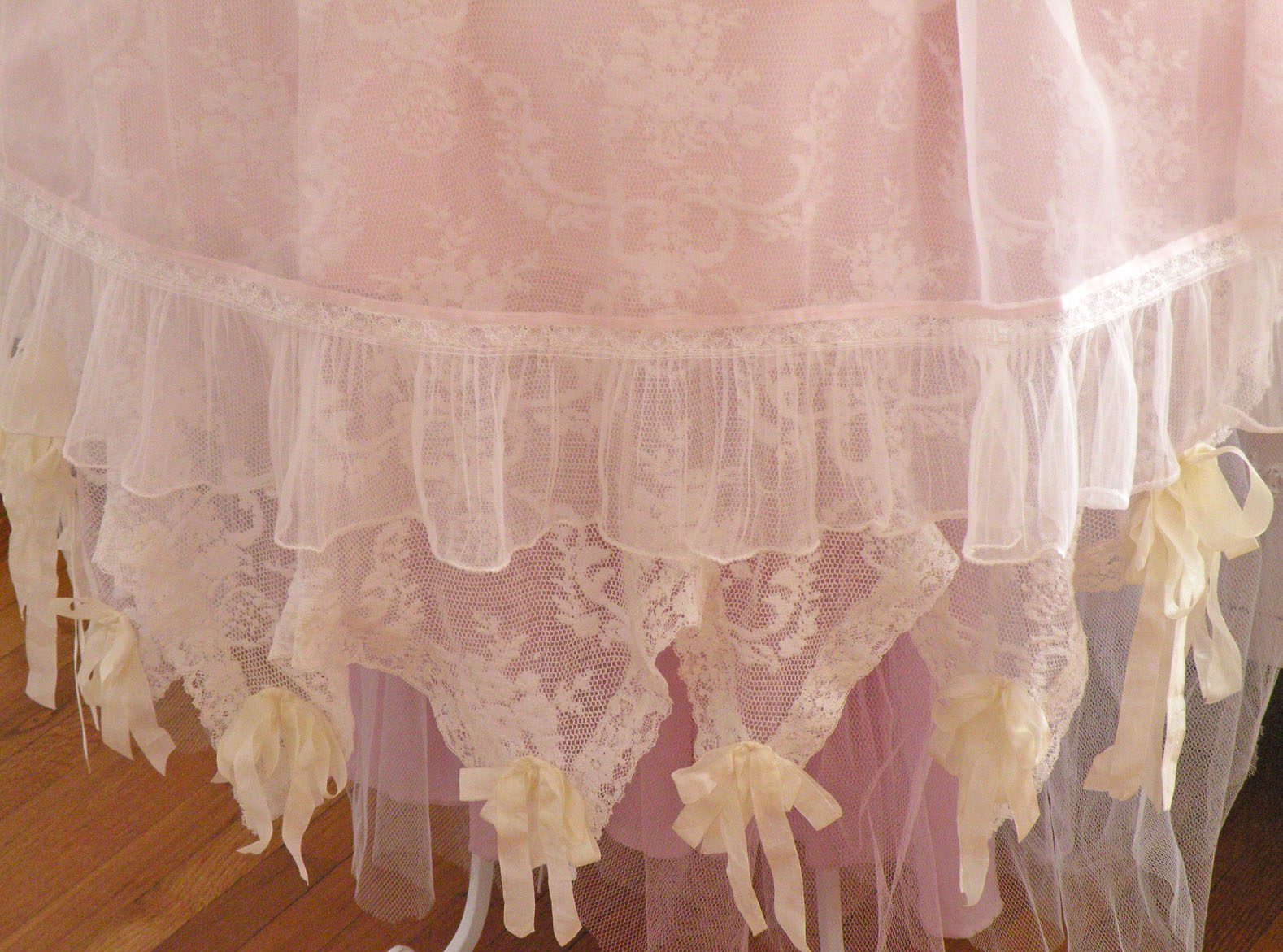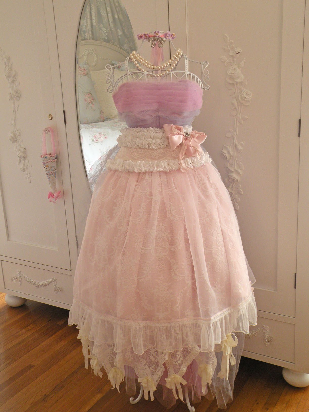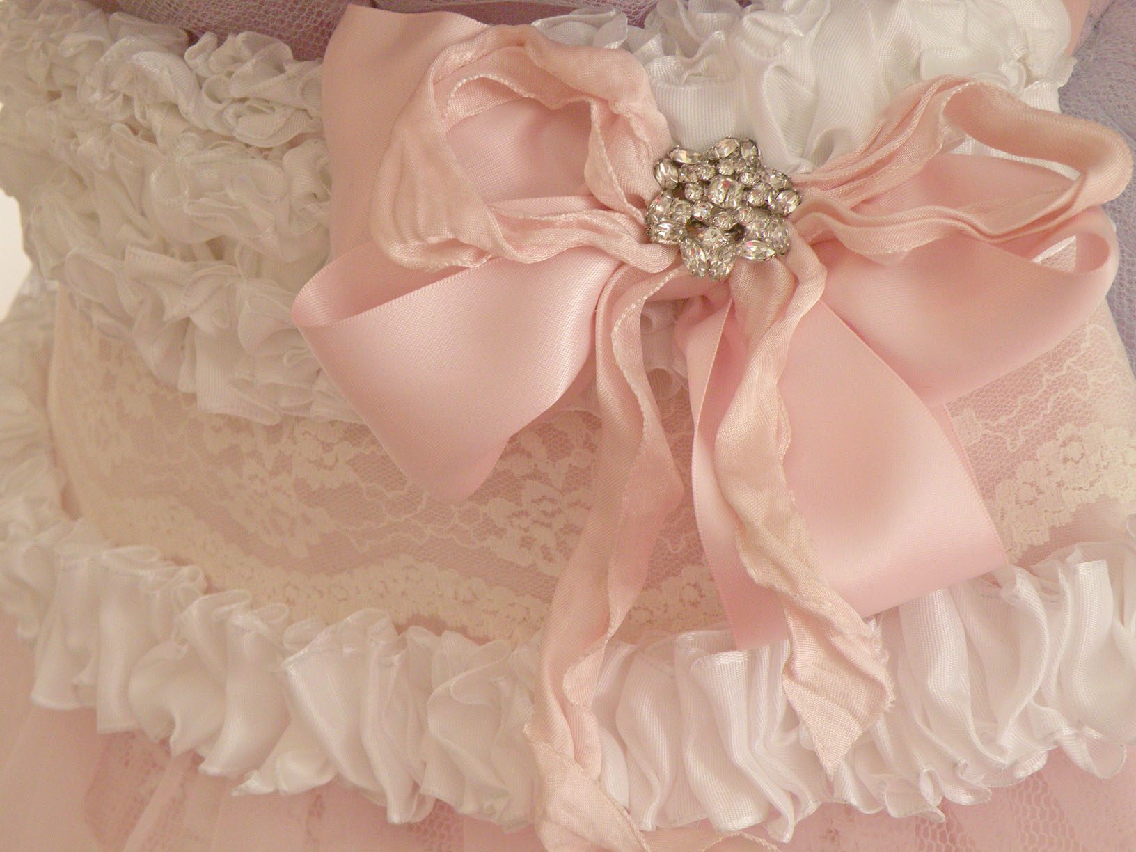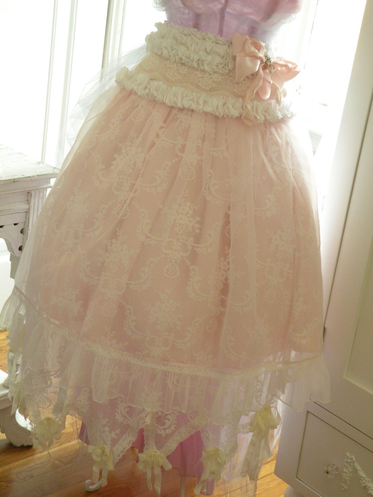 To me I like to describe it as a grand decadent pink chiffon layer cake. Layers of ruffle and vintage lace. The ruffle is the the icing on the cake!