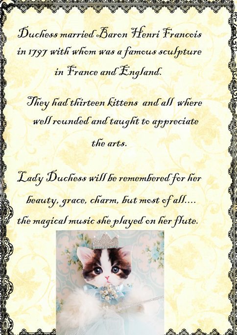 Awwwww LOVE your creations, the kitty is Darling!…..Love the Lady Duchess story!!!~~~ Wanted to stop by to say hello, hope all is well with you!!! xoxxo