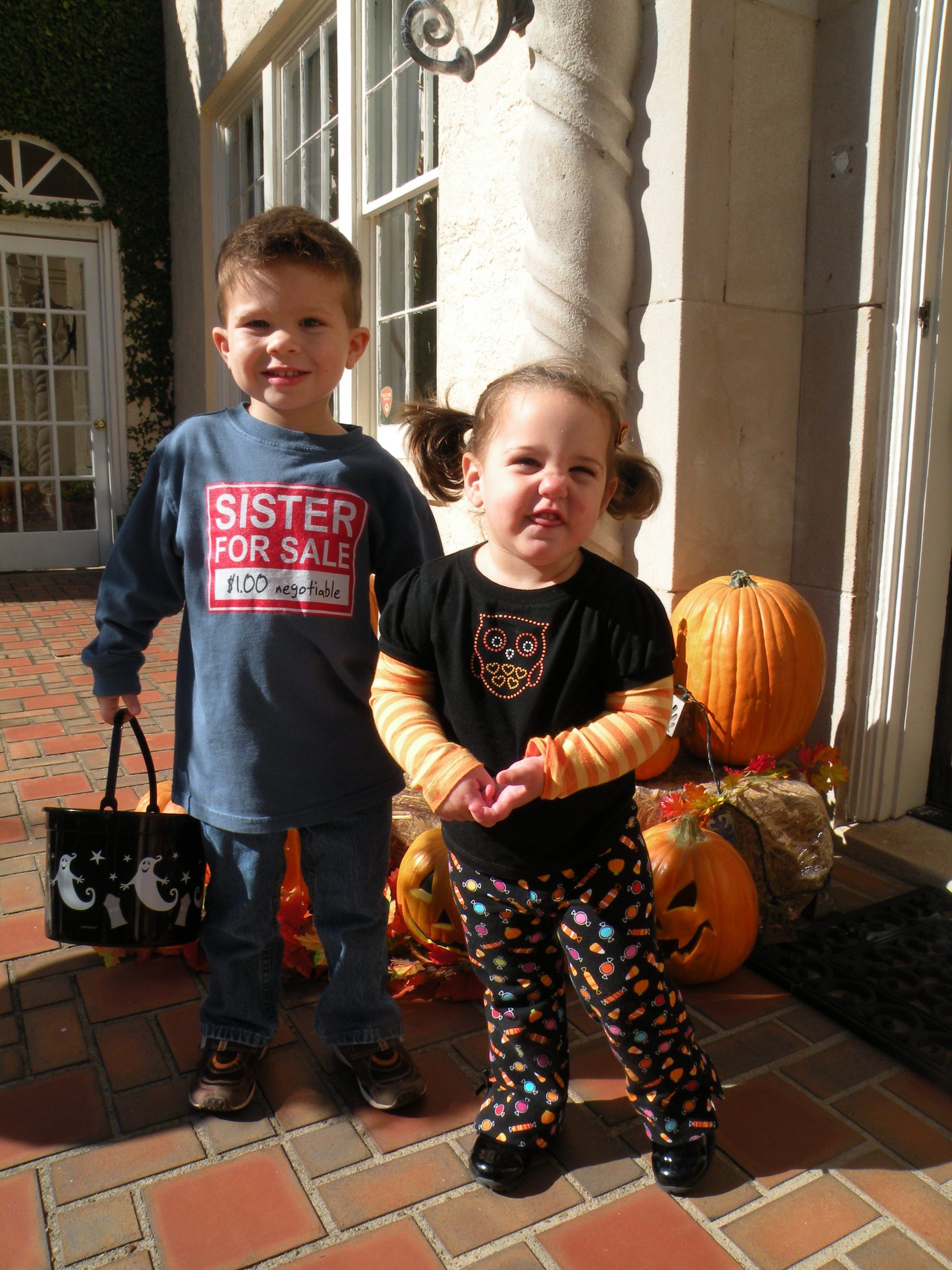 When I saw your little guy’s T-shirt, “Sister for Sale”, it reminded me of a story that always gets told at our family reunions…One day my brother answered the doorbell to find a man who said, “I’m here from the ARC (Association for Retarded Citizens) and have come for the donation pick-up.”…which my mom had agreed to previously. My brother promptly turned around and said, “Mary Lou, they’ve come to pick you up.” I would be mad, except this brother is one of the dearest people on earth, whom everyone loves!! And we were both very young. Hope this brought you a smile. : )