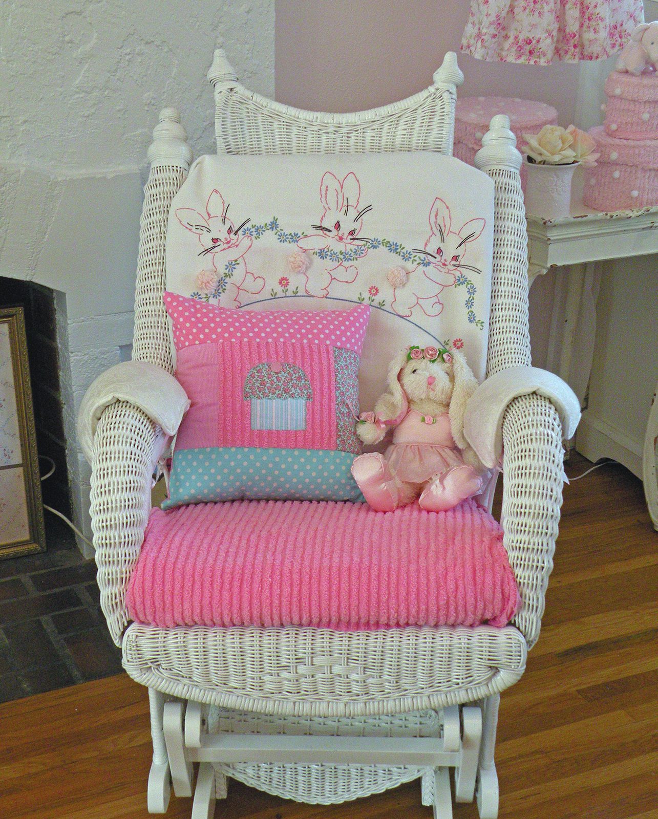 Vivi’s adorable rocking chair, and sweet pillow made by my friend Cheryl of Rosey Posey Confections.