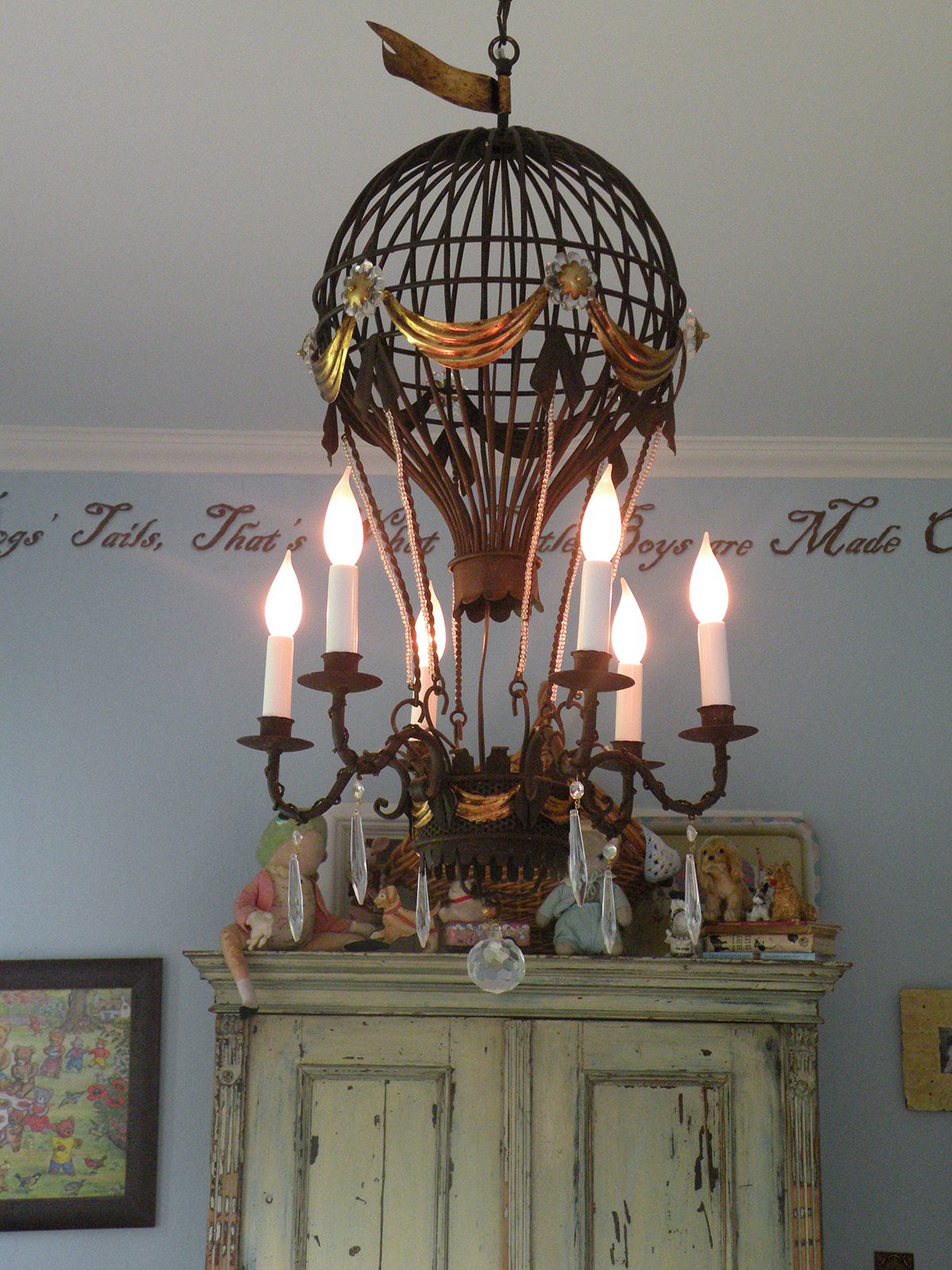 Now onto my darling Son’s room. His room was featured in the Jan 2007 issue of Romantic Homes. It has an old world vintage feeling to it. This is a photos of the darling and whimsical hot air balloon chandelier in his room.